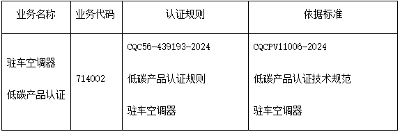 中国质量认证中心(英文缩写cqc)研发并推出了驻车空调器低碳产品认证业务,具体信息如下: